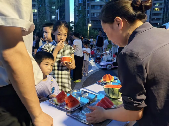 清凉沁润心脾: 志愿者们奔忙的身影是夜色中最动人的风景。他们一次次俯身,将冰镇酸梅汤与甘甜西瓜递至居民手中,冰凉清甜的汁水滑入喉间,瞬间驱散燥热。