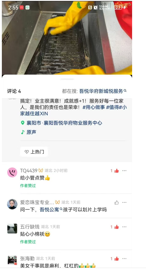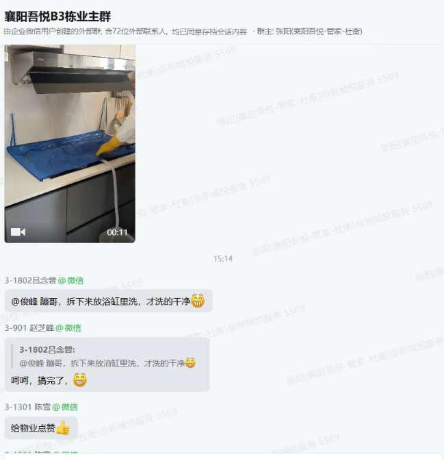 这场免费清洗活动,洗去的是油污与尘埃,凝聚的是邻里温情与社区共识。当业主们在业主群里纷纷晒出清洗前后的对比图,分享着物业人员的贴心瞬间时,群里的点赞与感谢刷屏不断。“住在这里,感觉特别踏实”“物业把我们的需求放在心上,这样的园区谁能不爱”…… 简单的话语里,是业主对物业工作的最大认可。