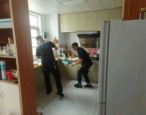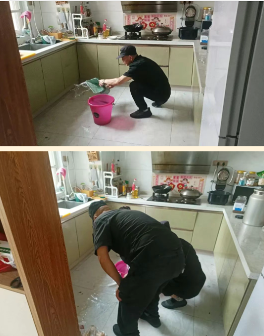 大约十分钟后,住户匆匆赶到打开家门。众人发现其厨房、餐厅、客厅及阳台均已积满水。见此情形,秩序维护部朱理瑞、谢国强,以及随后赶来的客服人员金兰兰,没有丝毫犹豫,迅速抄起水桶、盆子、拖把等工具,投入到紧张的排水“战斗”中。他们争分夺秒,将积水奋力扫入容器,然后一趟又一趟地往返倾倒。夏日的高温本就酷热难耐,不一会儿,他们就已经满头大汗,衣衫被汗水湿透,紧紧贴在身上。但他们全然不顾,一心只想着尽快帮住户清理积水,减少损失。
