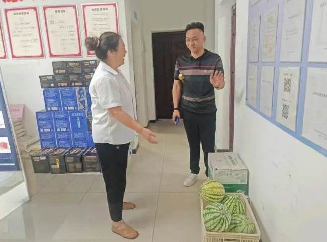 7月18日上午,营盘社区金色营盘小区内上演温情一幕:居民李师傅推着一筐沉甸甸的西瓜和两箱矿泉水走进物业办公室,向连日奋战在高温一线的物业维修、保洁师傅们送上清凉和关怀。