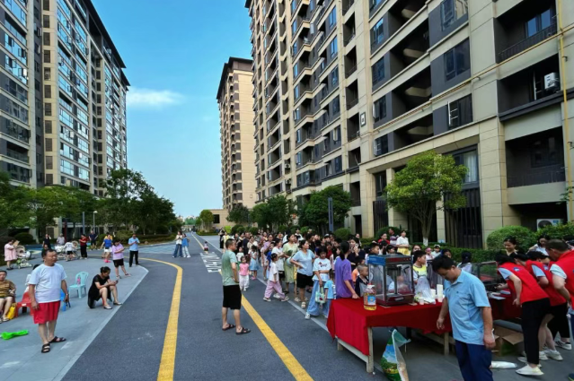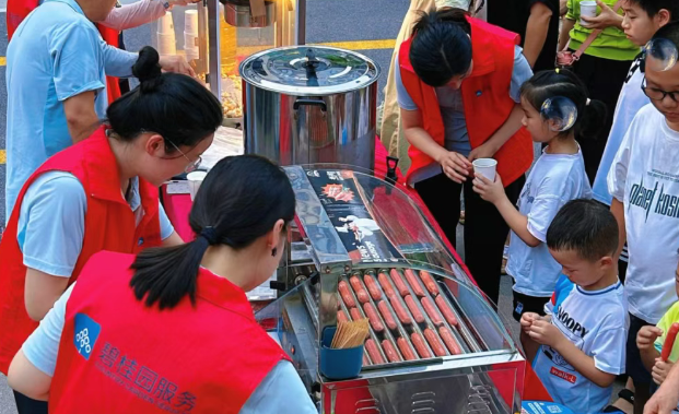 本次活动在小区物业服务中心广场准时拉开帷幕。三个精心搭建的摊位依次排开,分别负责现场烤制烤肠、现炸爆米花和制作酸梅汁,远远就能闻到诱人的香气。