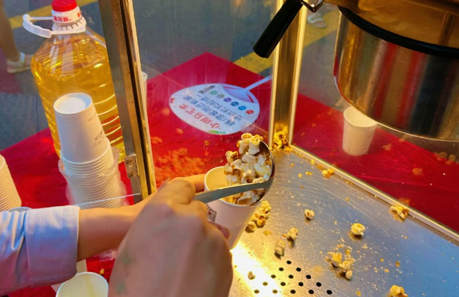 旁边的爆米花摊位也不逊色,工作人员先倒入金黄的玉米粒,再加入适量的食用油和白糖,盖上盖子快速转动。随着 “砰砰砰” 的声响,一颗颗玉米粒在高温下炸开,变成蓬松雪白的爆米花,满满的一锅散发着甜香。刚出锅的爆米花还带着温热,装进纸筒里,递到业主手中,让人忍不住立刻尝上一口,脆甜的口感瞬间征服味蕾。