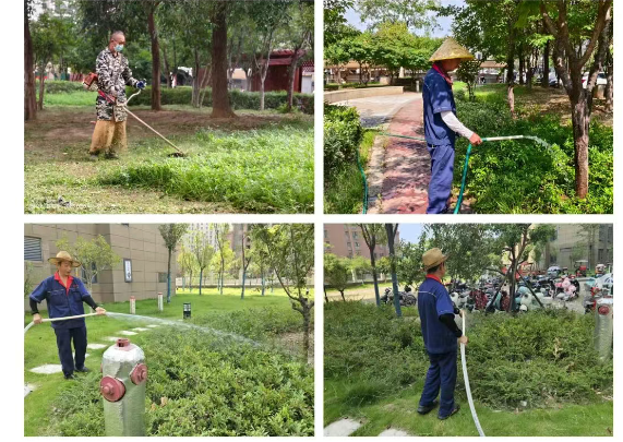 绿化养护员是园区的“园丁”,在高温下与时间赛跑。天未破晓,他们便扛起沉重的管线,穿行于楼宇之间,为每一株花草、每一棵树木送去“及时雨”。随着烈日攀升,地表滚烫,他们顾不上休息,仔细修剪枯枝、除草......,只为绿植能茁壮成长。烈日下,他们被晒得黝黑的面庞上满是专注和执着,为了让园区始终保持绿意盎然,为业主们带来一丝视觉上的清凉慰藉,他们不辞辛劳,默默付出着。正是他们的悉心呵护,让小区在高温的侵袭下,依然充满生机与活力。
