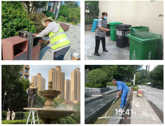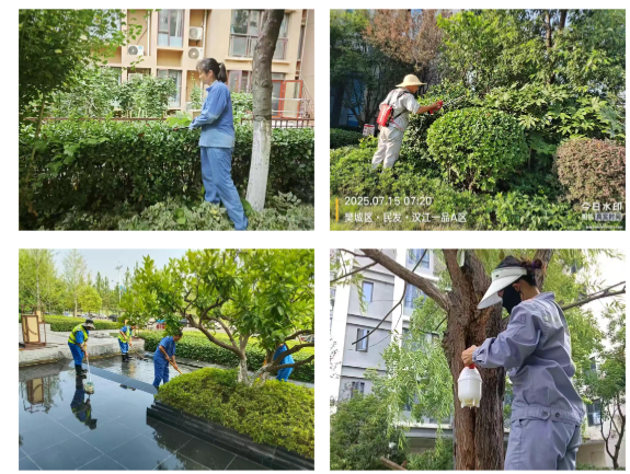 保洁员与绿化员们不怕脏不怕热,确保小区清新整洁、绿意盎然,为业主提供一片清凉的绿荫。