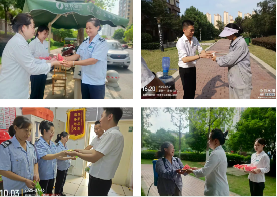 各小区也为户外员工准备了酸梅汤、绿豆汤、西瓜、冰饮等,主动送至各岗位,提醒员工注意防暑降温。