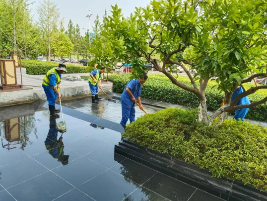 夏季来临,绿化保洁条线工作时间提前至清晨5点。修剪绿植、抗旱保苗、清理杂草;清洗景观水池、打扫楼栋卫生、冲洗消杀垃圾桶。趁着温度还未升起,工作人员们早已完成了大部分的工作。