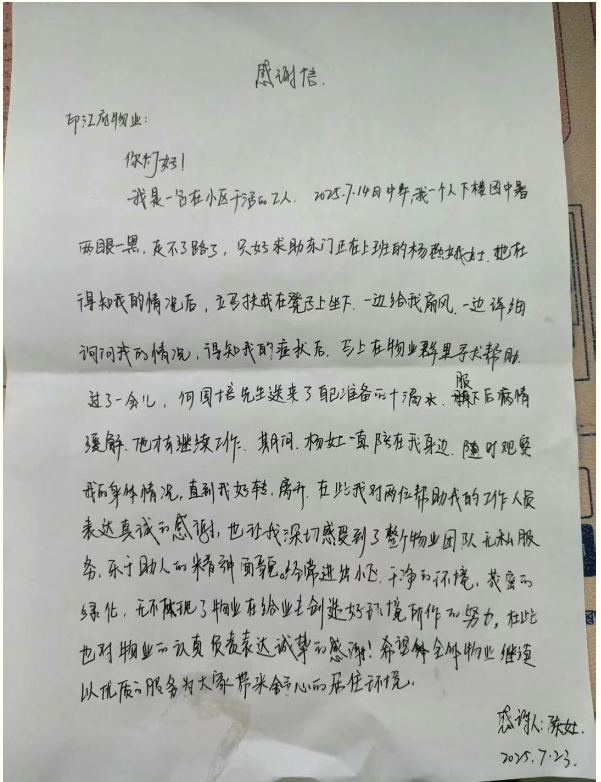 2025年7月23日傍晚,印江府物业服务中心收到了一封特殊的感谢信。写信人陈女士并非小区业主,而是一位在小区工作的普通工人。这封信的背后,是一个关于物业人无差别关怀的暖心故事。