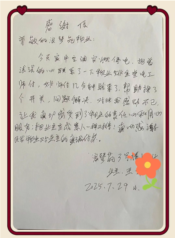 2025年7月29日上午9点10分,浪琴苑3号楼业主手捧一封感谢信,走进了物业服务中心。信纸虽轻,却承载着沉甸甸的感激之情。