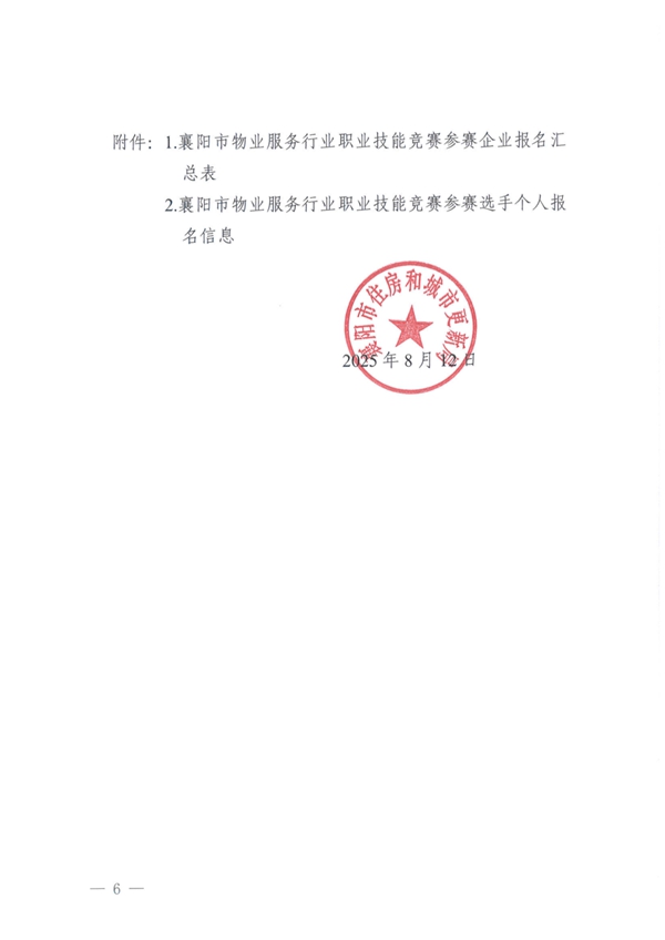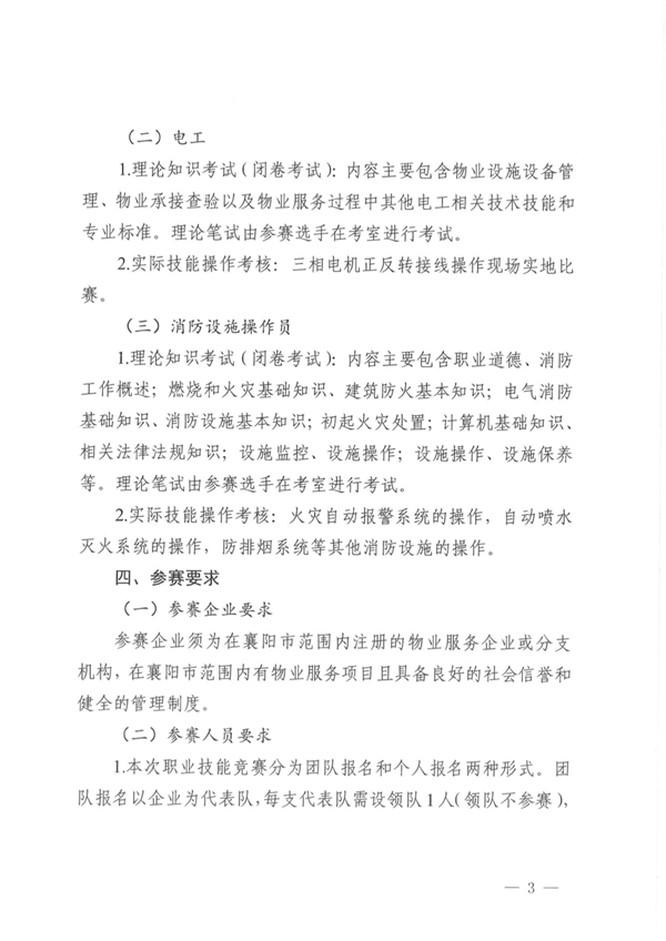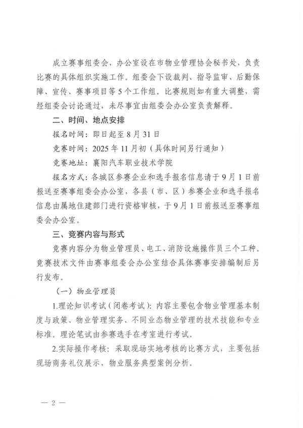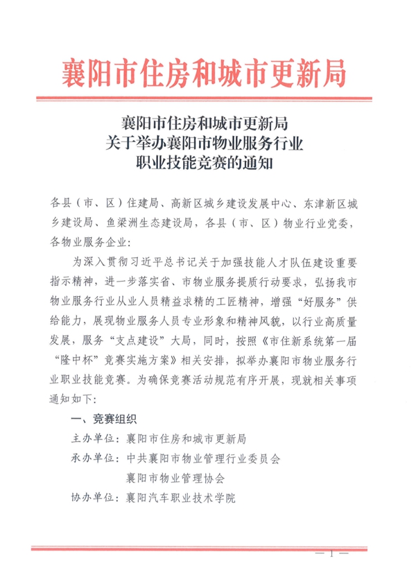 为深入贯彻习近平总书记关于加强技能人才队伍建设重要 指示精神,进一步落实省、市物业服务提质行动要求,弘扬我市物业服务行业从业人员精益求精的工匠精神,增强“好服务”供给能力,展现物业服务人员专业形象和精神风貌,以行业高质量发展,服务“支点建设”大局,同时,按照《市住新系统第一届“隆中杯”竞赛实施方案》相关安排,拟举办襄阳市物业服务行业职业技能竞赛。为确保竞赛活动规范有序开展,现就相关事项通知如下: