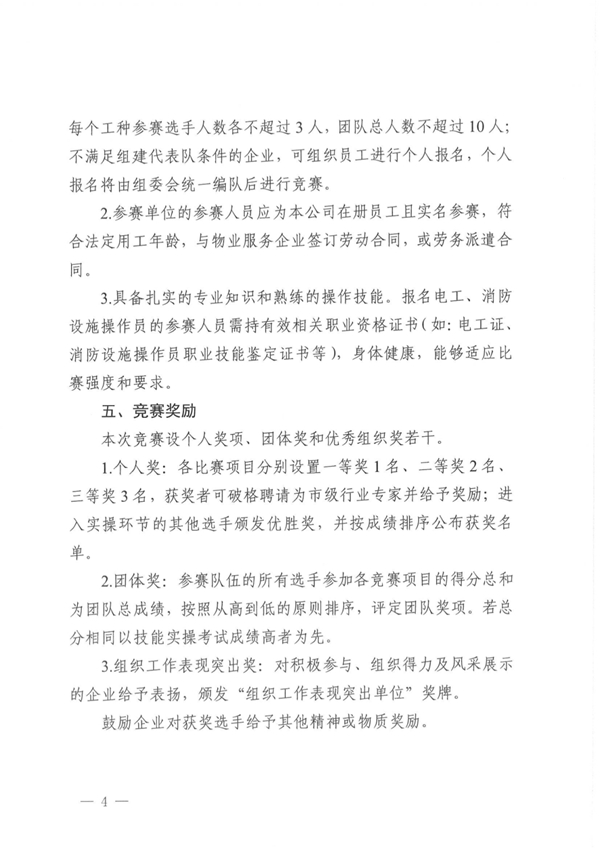 (一)本次竞赛是我市物业服务行业的一次重要活动,也是对我市物业服务企业整体服务水平的一次检验,请各物业企业接到通知后,高度重视本次技能比赛工作,加强领导,精心组织,广泛宣传,认真训练,积极组织和选拔参赛,并以此次活动为契机,把物业服务与实际业务紧密结合起来,有效促进服务水平和业务满意度的整体提升。
