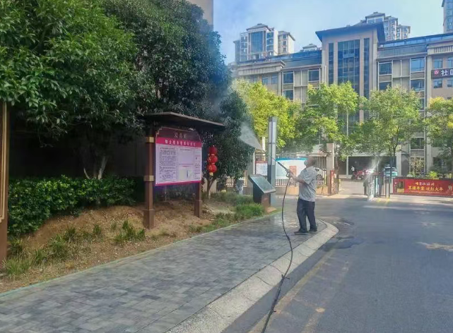 8月15日上午,在营盘社区金色营盘小区可以看到物业引入一大型发电式喷雾器在开展全面消杀行动,该设备凭借消杀效果好、覆盖面积大的优势,成为小区蚊虫防控的“硬核神器”。