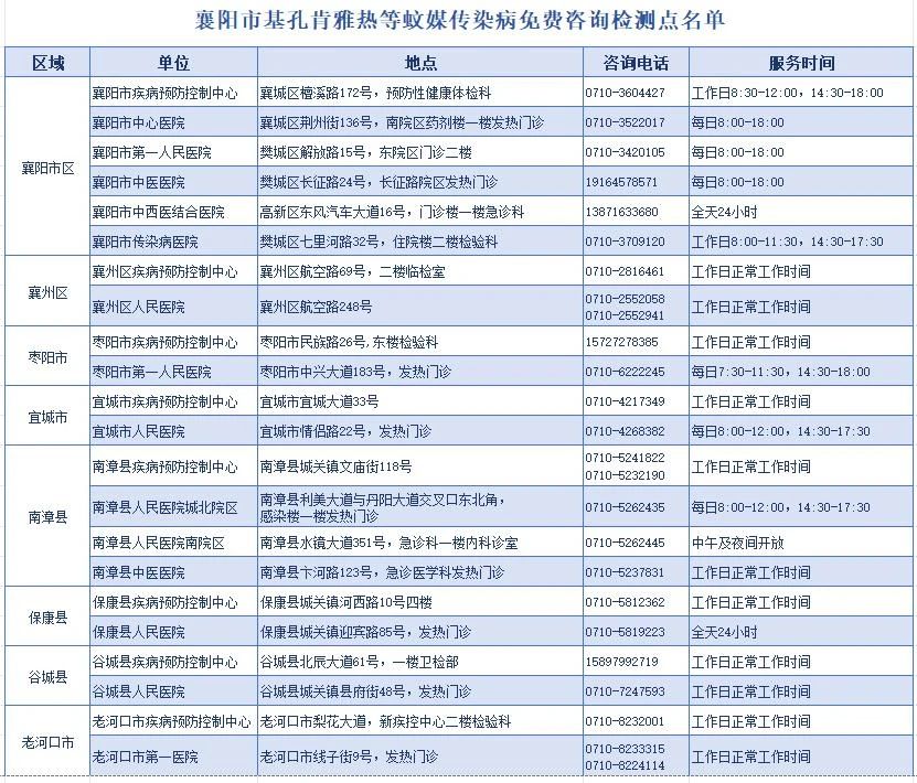 为切实保障广大市民朋友身体健康,方便大家及时掌握自身健康状况、有效防范蚊媒传染病传播风险,自即日起,在各地疾控中心和部分医疗机构设置基孔肯雅热等蚊媒传染病免费咨询检测点,面向市民免费提供相关咨询及检测服务。近期从境外或广东、广西等高风险地区来(返)襄阳的人员,如出现发热、关节痛、皮疹等症状,可主动到就近的免费咨询检测点进行咨询、检测。