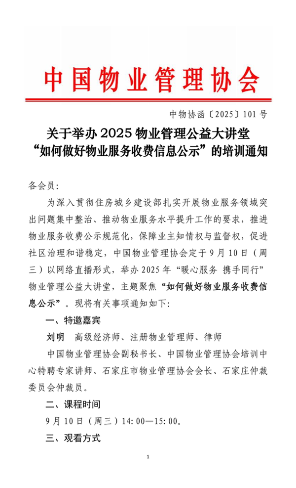 关于举办2025物业管理公益大讲堂“如何做好物业服务收费信息公示”的培训通知