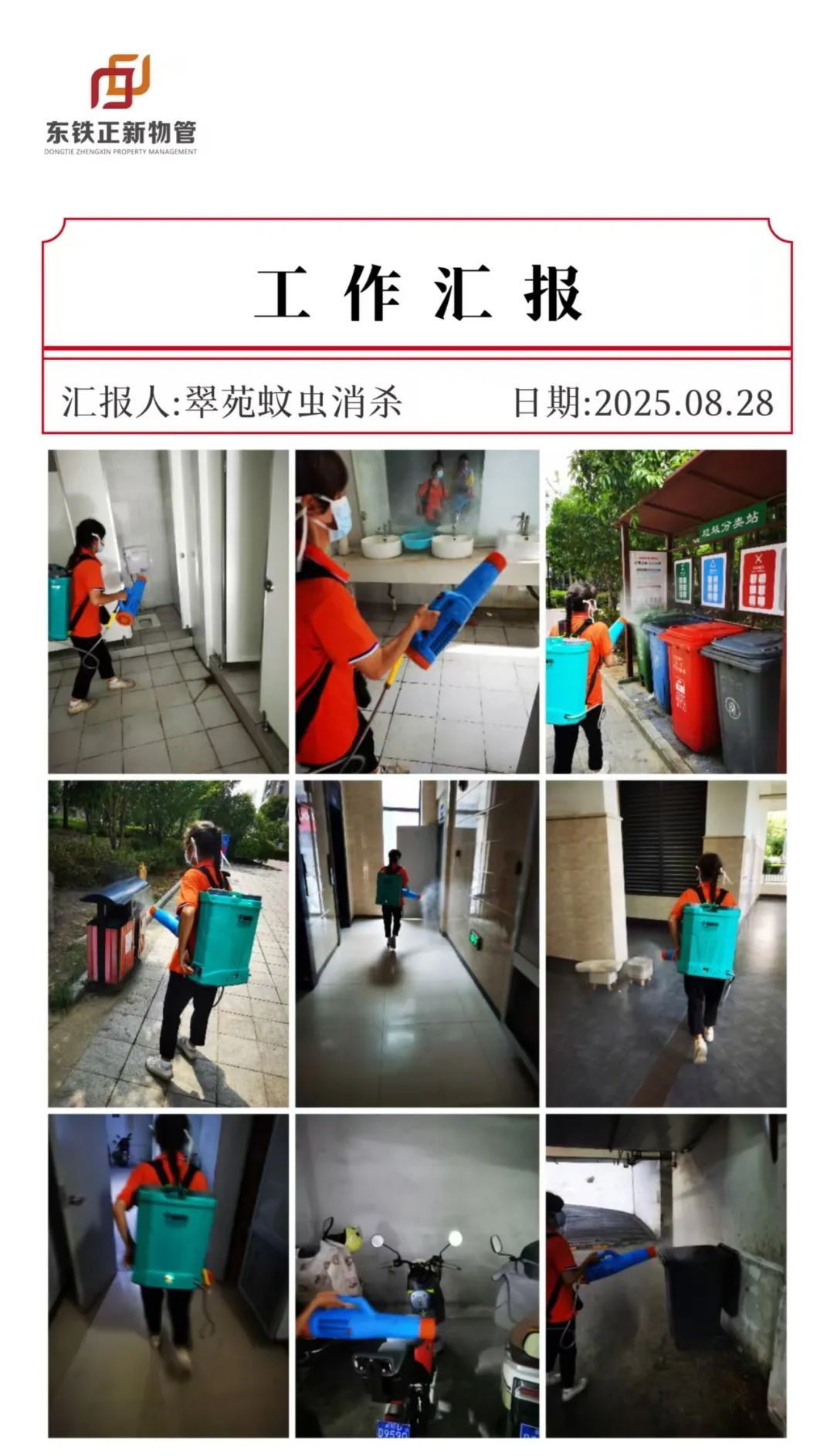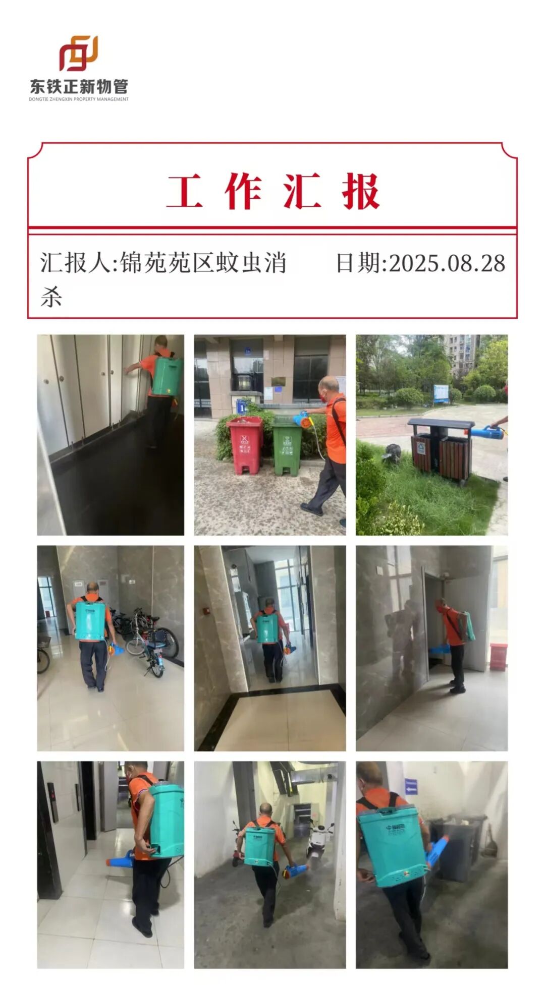 在此,我们特别提醒亲爱的业主家人们:请尽量远离消杀区域。虽本次使用的消杀喷剂均为安全用剂,但为了您和家人的健康,仍需注意避让;养宠物的业主更要妥善看管爱宠,避免其误舔喷剂。面对高温天气,襄阳东铁正新物业将不定期开展蚊蝇消杀和垃圾清理行动,号召各位业主同时做好家庭防蚊虫措施,凝聚起“物业+居民”的防控合力,共同保障广大业主的健康与安全,营造良好的生活环境。