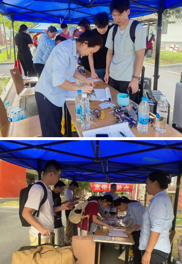 迎新期间,整个小区洋溢着温馨有序的氛围。主干道上,醒目的主题横幅随风飘扬,精心布置的装饰增添了喜庆色彩;工作人员还贴心准备了消暑解渴的绿豆汤,供奔波的新生享用。由红管家与志愿者组成的“迎新引导工作组”,驻守在小区出入口、楼栋大厅等关键点位,不仅协助新生高效办理入住手续、搬运行李,还耐心解答水电费缴纳、宽带安装等生活问题,让新生们第一时间感受到便捷与温暖。