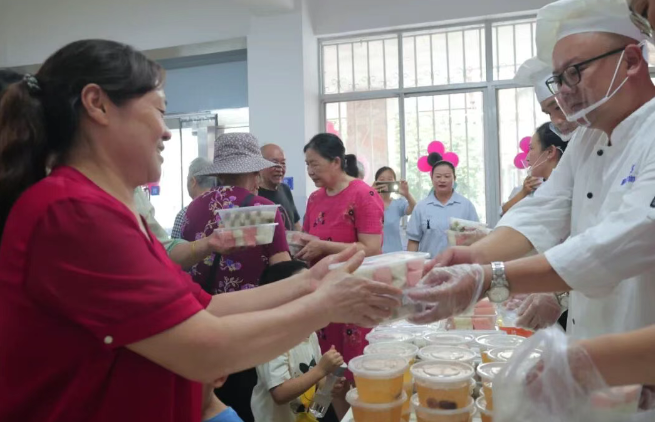 走进幸福食堂,浓郁的七夕氛围扑面而来,整个食堂洋溢着欢乐祥和的氛围。活动现场襄投物业为社区居民准备了专属福利,凭结婚证可免费领取特色糕点。这些糕点均由食堂师傅手工制作,双色糕口感软糯香甜,寓意夫妻同心,双色相依;马蹄糕口感清爽Q弹,象征爱情甜甜蜜蜜,长长久久。当天,不少夫妻携手来到食堂,开心地领取糕点,并在浪漫的装饰下打卡拍照。“结婚30年了,还是第一次在食堂过七夕,不仅环境漂亮,还能领到免费的糕点,心里特别暖。”居民李阿姨拿着糕点,脸上满是幸福的笑容。活动最后,中山巷社区和襄投物业工作人员共同为辖区独居老人送上爱心餐,为老人们送去节日关怀与温暖。