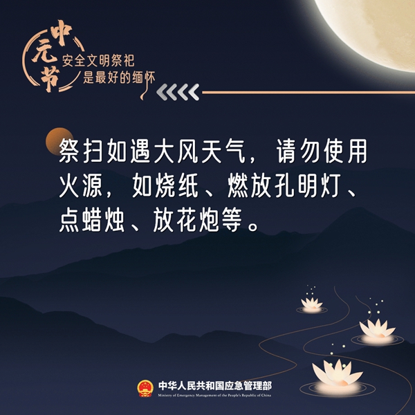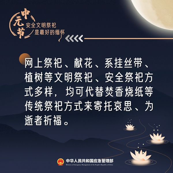 中元寄哀思,花下念故人! 2025年9月6日(农历七月十五)秋风已至,又逢中元。 作为传统祭祀节日,它承载着对逝者的缅怀与对生命的敬畏。 在移风易俗、崇尚新风的今天,我们更应倡导文明、绿色、环保的祭祀方式,让哀思有更庄重而洁净的表达。 中元节 严守安全底线,共护绿色家园 禁燃禁烧 请勿在小区内以下区域焚烧纸钱、燃放鞭炮:各楼栋楼层、楼道、天台、单元门口及地下停车场;公共绿化带、草坪、树下等植被区域;靠近杂物、电线、燃气管道等易燃物的位置。小区内严禁祭扫。 倡导文明新风,践行低碳祭祀 绿色祭扫 鼓励采用鲜花祭祀、植树绿化、网络追思等环保方式表达哀思,减少环境污染,营造洁净的祭奠氛围。 多关怀、陪伴在世长辈,以孝心延续亲情,让追思融入日常,使家风更温暖、更绵长。 让我们以文明安全的方式 文明祭祀,远离火患 来源:物管纵横