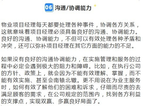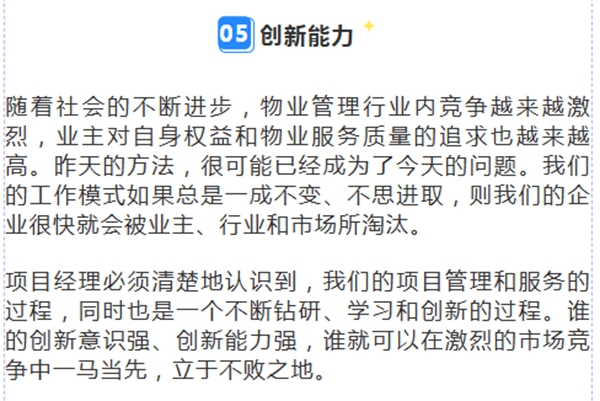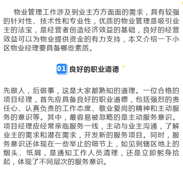 以上就是小区物业经理要具备哪些素质的介绍,物业管理人员只有明确并树立以上观念,才能真正成为合格优秀的管理者。