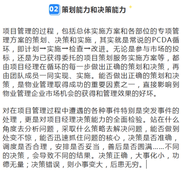 作为项目经理,虽然不需要像技术专家或专业技术人员那样掌握专业的技术,但其必须能在日常工作中对设施、工程和人员进行有效的管理,能迅速应对各种局面和情况,能从容审定各类技术实施方案、指挥各类维修养护工程的进行、有效控制接管验收的关键点等,这就要求项目经理除了必备的专业知识还应掌握较全面的综合知识和牢固的专业技能。