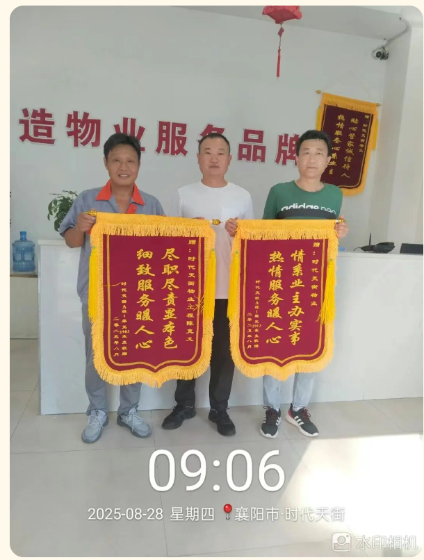 业主目睹物业人员满身污渍、汗流浃背却毫无怨言,感动地连连致谢。8月28日一早,业主特地送来两面锦旗,亲手交到物业团队手中,锦旗上“尽职尽责显本色,情系业主办实事”的字样,表达了对物业服务的高度认可。 这面锦旗,不仅是一份荣誉,更是对时代天街物业人专业服务与应急能力的高度认可。我们始终坚信:物业服务无小事,唯有以心换心,方能不负所托。时代天街物业团队将继续秉持“急业主所急,忧业主所忧”的服务理念,以实际行动践行企业的责任与担当,为每一位业主提供更安心、更舒适的居住环境。 来源:山河锦秀物业