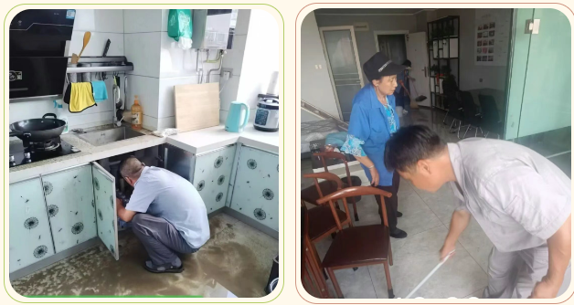 项目徐主任立即带领客服与秩序队员携工具支援。经排查,确定为楼栋主下水管道堵塞。工程人员迅速展开疏通作业,其他同事协助清理室内积水。通过团队高效配合,仅用十分钟便恢复管道畅通,并完成现场清理工作。