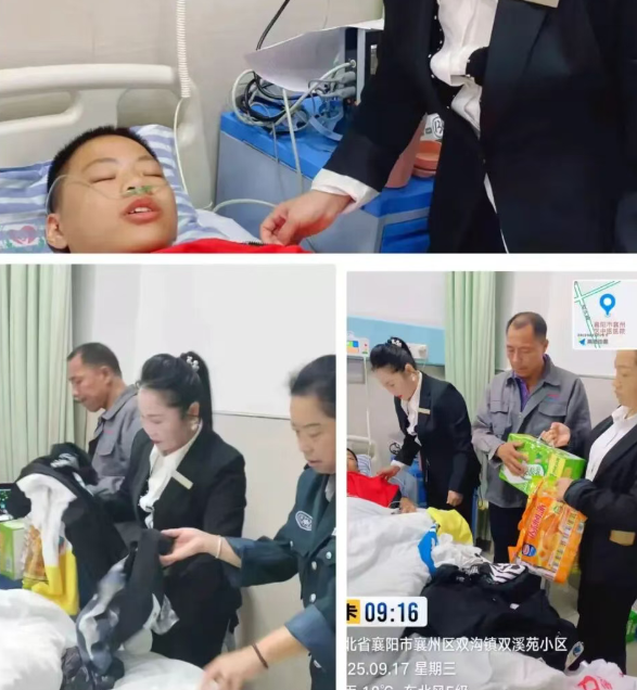 在病房内,物业王经理亲手将食品与生活用品送到患者手中,床边堆放的物资虽不贵重,却承载着沉甸甸的关怀。患者戴着氧气面罩,眼神中流露出感激之情。这份来自小区的牵挂,不仅缓解了生活的不便,更给予了精神上的慰藉。在双溪小区,物业服务早已超越日常管理,成为邻里之间温暖的纽带。