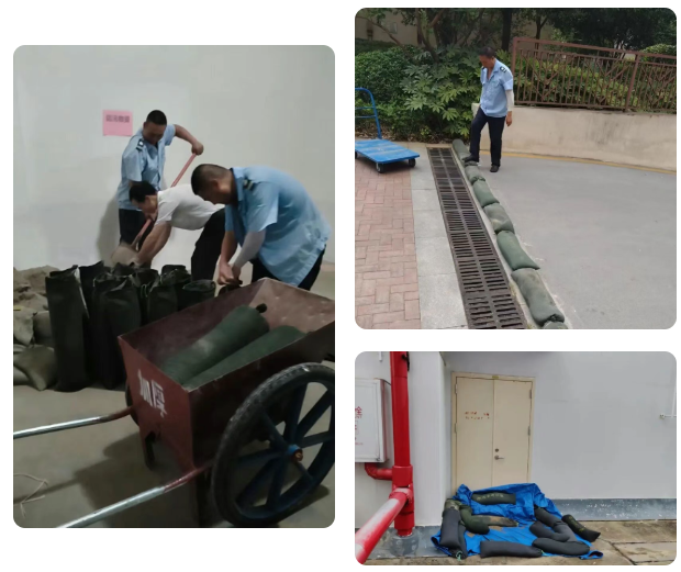暴雨到来前,秩序安全条线的队员们第一时间在对地下车库、地下室、设备机房、配电室等低洼易涝区域进行重点巡视,检查挡水板、沙袋配置是否齐全有效。
