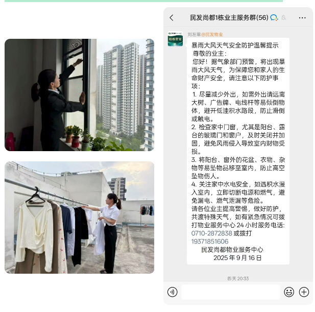 客服条线的工作人员则成为连接物业与业主的“连心桥”。他们及时在业主群发布天气预警和防汛温馨提示,在接到业主求助后,主动上门帮助关窗、收衣。