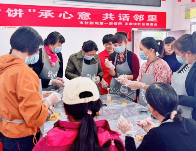工作人员将现场装扮的焕然一新,在制作过程中,“指导老师”耐心的演示月饼的制作流程。从揉面、包馅到压模,每一个细节都讲解得生动细致,住户们一边认真的看着一边动手操作,有的揉面力度不均,有的馅料包裹不严,在志愿者和工作人员的耐心协助下,一个个漂亮的的冰皮月饼就呈现出来,现场欢声不断,面香弥漫,邻里之间的默契在指尖传递。