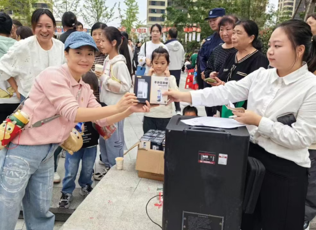 猜灯谜区域同样人气爆棚,挂满红灯笼的绳线上,一张张写满谜题的彩纸随风飘动,吸引着业主们驻足思考。大家独自沉思,或三五成群讨论,每当有人猜出答案,欢呼声便此起彼伏,随后开心地到工作人员处领取精美小礼品。