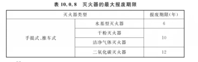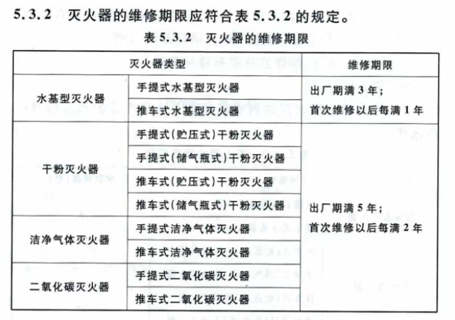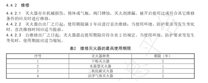 4.4.2.3条款规定,自维修出厂之日起,灭火器最高使用期限要符合表2的规定。同样,当使用环境、防护要求等发生变化时,使用期限要适当缩短。其中,常用的干粉灭火器和二氧化碳灭火器最高使用年限都是2年(水基灭火器为1年)。