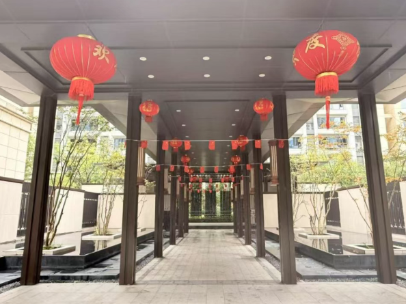 为营造浓厚的节日氛围,襄投物业精心策划并实施了园区节日氛围布置工作。国旗迎风飘扬,在小区主要出入口、主干道两侧及园区中心广场等显著位置悬挂五星红旗,营造出浓厚的国庆氛围;红灯笼高悬,于园区树木、连廊、单元门口等处点缀中式红灯笼和中国结等传统装饰;主题宣传同步跟进,利用电子显示屏和宣传栏滚动播放节日祝福语、温馨提示及安全宣传内容。火红的灯笼与飘扬的国旗交相辉映,使业主一踏入小区便能感受到节日的喜悦与“家”的温暖。