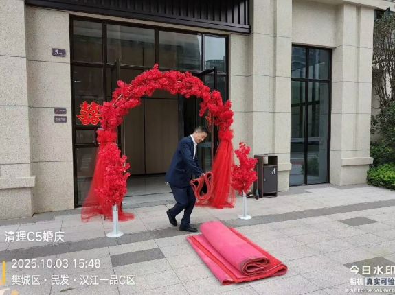 节日氛围的营造与个性化服务,则由客服条线的同事们贴心承担。国庆期间喜结连理的新人增多,客服条线的工作人员主动帮助进行婚庆氛围布置,为新婚业主喜添一份甜蜜与温馨。
