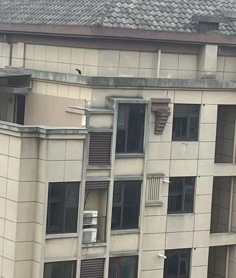 第二天,业主再次反映猫叫声依旧,物业经理亲自带领安保人员上门复查,最终在楼顶边缘发现了这只猫。由于猫所处位置特殊,驱赶难度大,物业工作人员尝试多种方式未果,仍不放弃,主动寻求外部援助。