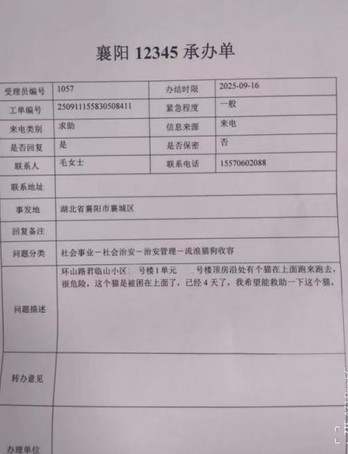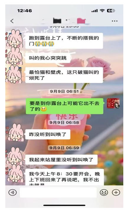 2025年9月初的一天,小区业主向物业反映,自家露台附近有一只猫持续叫唤,严重影响正常休息。接到报事后,物业服务中心第一时间响应,楼管上班后迅速上门查看,虽未见到猫,但已听到明显叫声,随即记录并持续关注。
