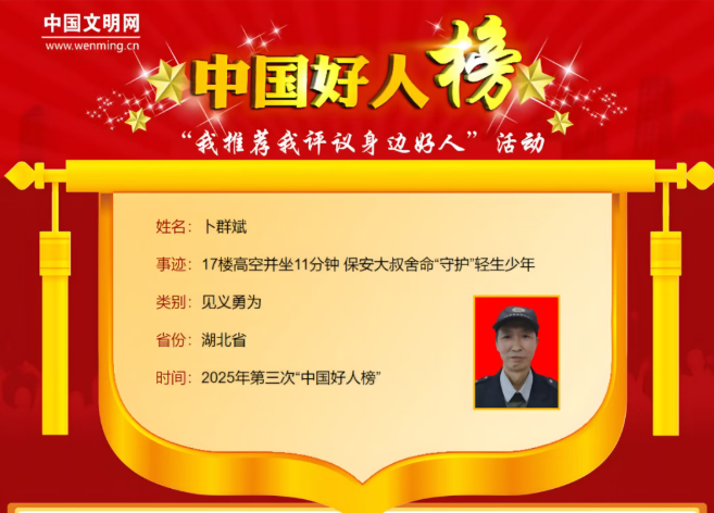 2025年10月15日,中央文明办发布2025年第三次“中国好人榜”,民发物业秩序队员卜群斌以“17楼高空并坐11分钟,保安大叔舍命‘守护’轻生少年”的英勇事迹,光荣登上“见义勇为”类榜单。这位57岁的保安大叔,用无私勇气诠释了平凡岗位的非凡担当,他的英勇事迹也得到更广泛的肯定。
