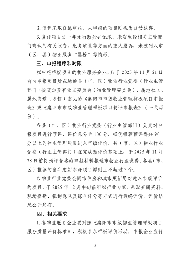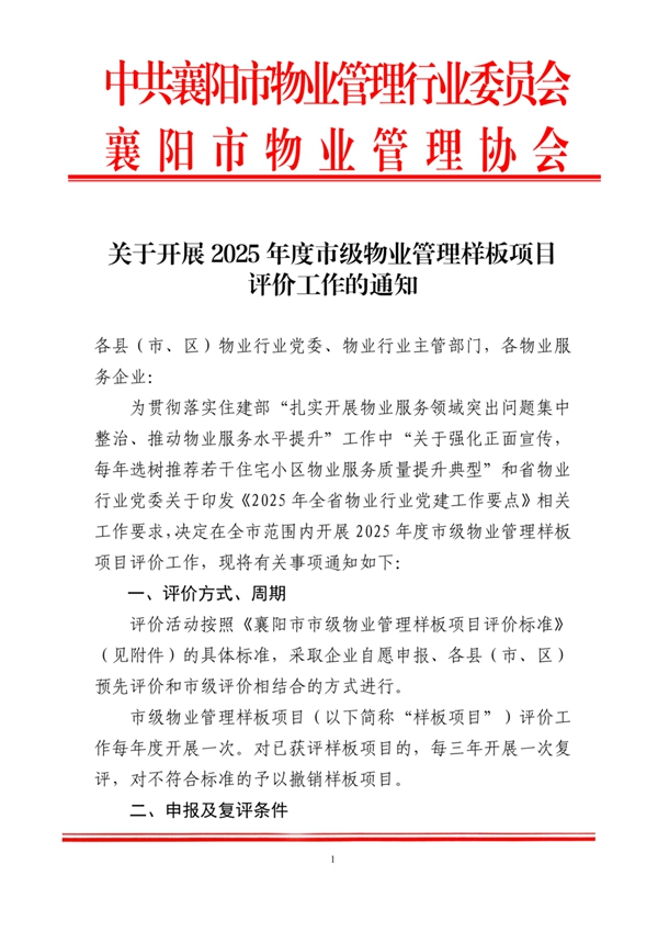 为贯彻落实住建部“扎实开展物业服务领域突出问题集中整治、推动物业服务水平提升”工作中“关于强化正面宣传,每年选树推荐若干住宅小区物业服务质量提升典型”和省物业行业党委关于印发《2025年全省物业行业党建工作要点》相关工作要求,决定在全市范围内开展2025年度市级物业管理样板项目评价工作,现将有关事项通知如下: