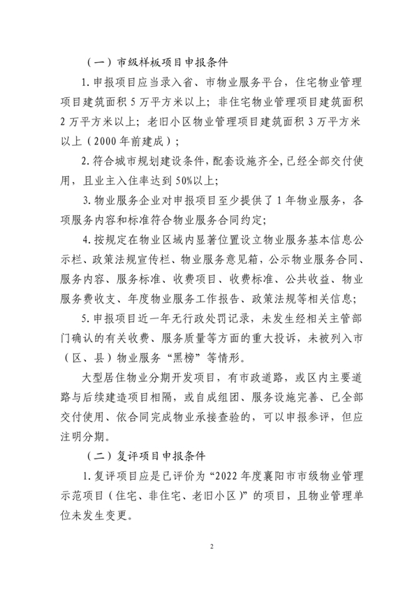 l.复评项目应是已评价为“2022年度襄阳市市级物业管理示范项目(住宅、非住宅、老旧小区)”的项目,且物业管理单位未发生变更。