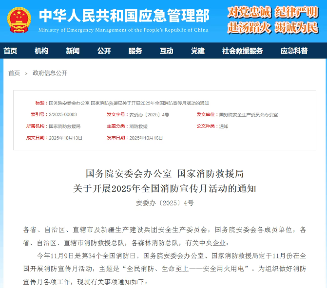 今年11月9日是第34个全国消防日。国务院安委会办公室、国家消防救援局定于11月份在全国开展消防宣传月活动,主题是“全民消防、生命至上——安全用火用电”。为组织做好消防宣传月各项工作,现就有关事项通知如下: