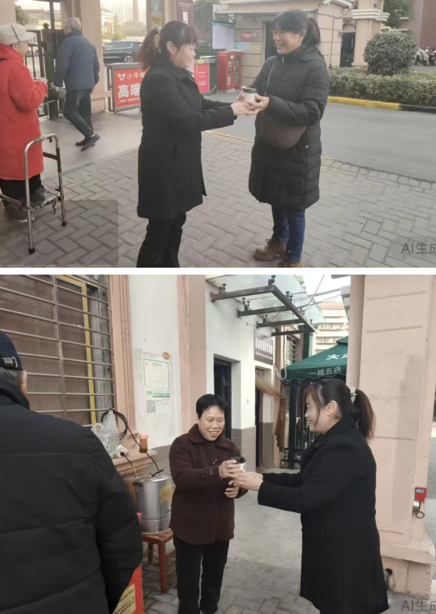 一句句贴心的问候,一杯杯温暖的姜茶,化作一股股热流,为早起的业主送去了清晨的第一份关怀,用一杯暖茶的温度,一句暖心的话语,唤醒这个冬日的温暖与温柔。