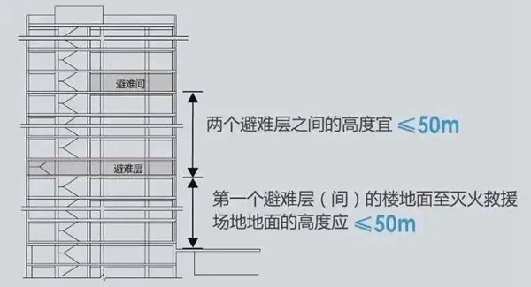 第一个避难层的楼地面至灭火救援场地地面的高度不应大于50m,两个避难层之间的高度不宜大于50m。