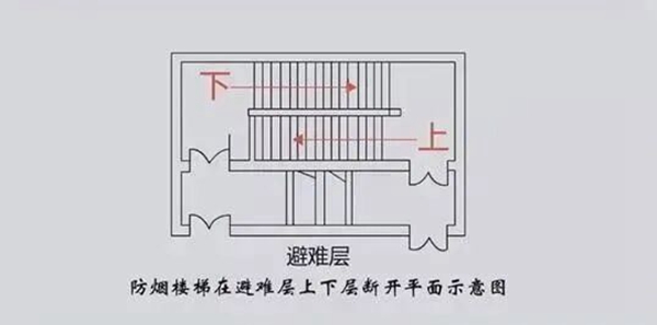避难层的防烟楼梯会在避难层分隔、同层错位或上下层断开,人员均必须经避难层方能上下。比如说15层是避难层,从16楼走楼梯下来,没办法直接下到14楼,因为15楼的楼梯错开了,你必须进入避难层,可能要拐几个弯或者绕一圈,从错开的楼梯下去。