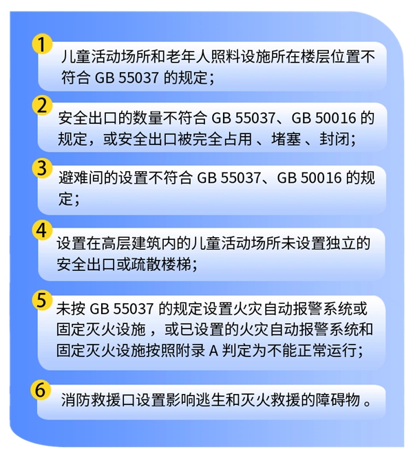 儿童活动场所、老年人照料设施和医院的门诊楼、病房楼具有以下情形之一的,应判定为重大火灾隐患