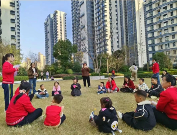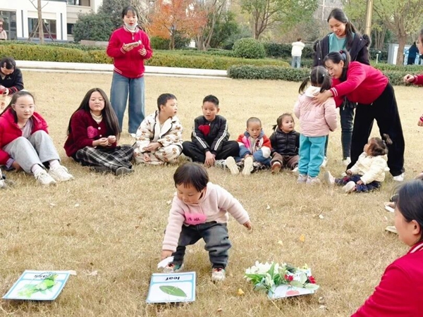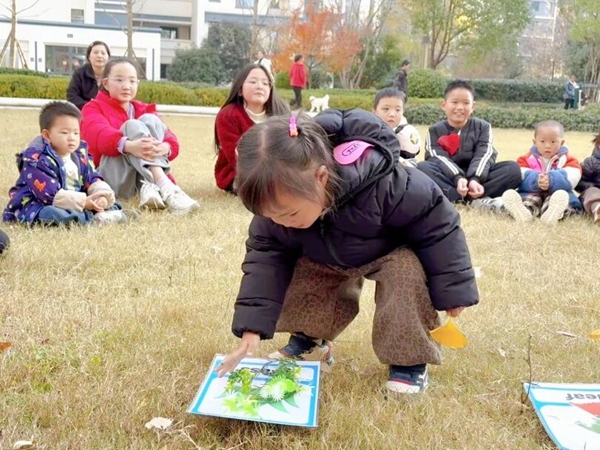 英语热身结束后,便是创意挥洒的树叶画创作环节。孩子们在家长和老师的陪伴下,化身小小探险家,兴致勃勃地“寻找小区里的秋天”。