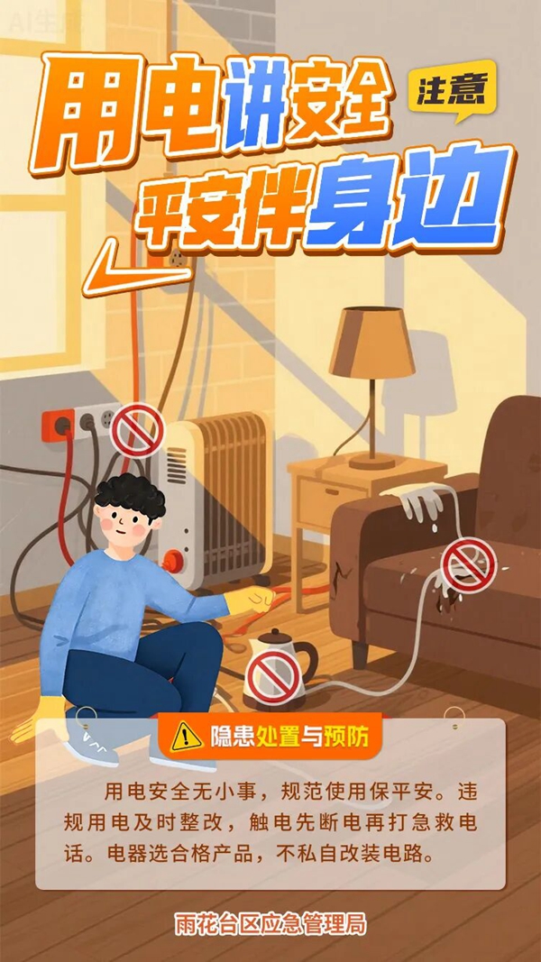 居民自查:日常使用合格电器产品,严禁私自改装电路;不随意拉扯电线、不超负荷用电;勿湿手触碰电器,电器进水后不可继续使用。