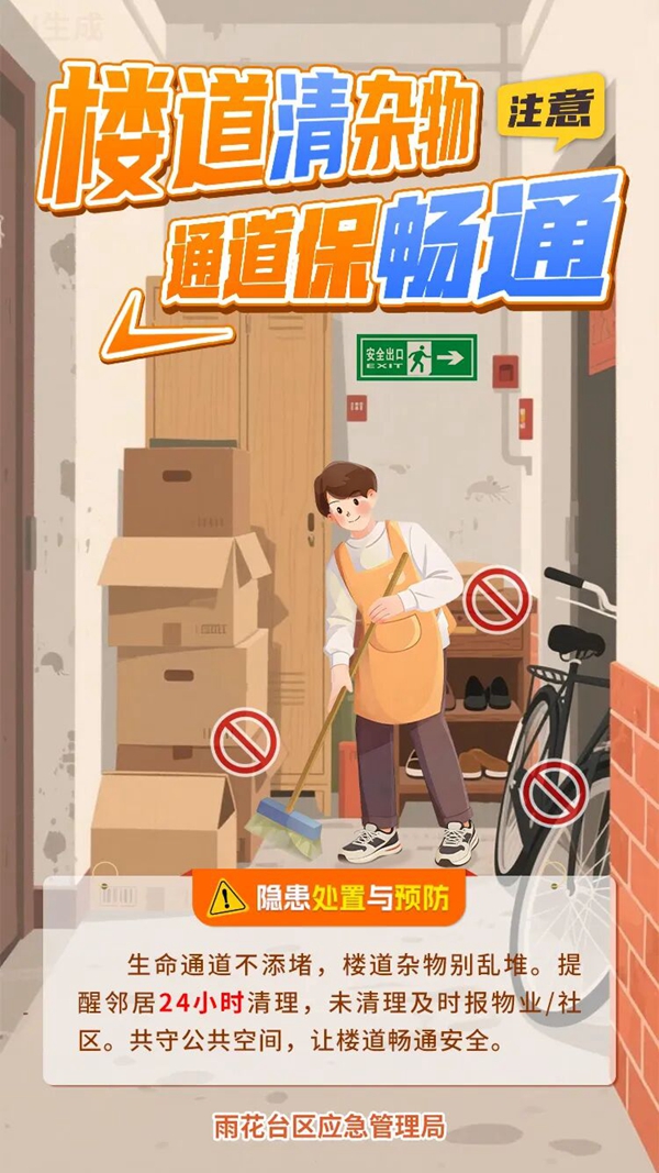 物业保障:应定期开展楼道清障整治,张贴安全警示标识,全力保障通道畅通。