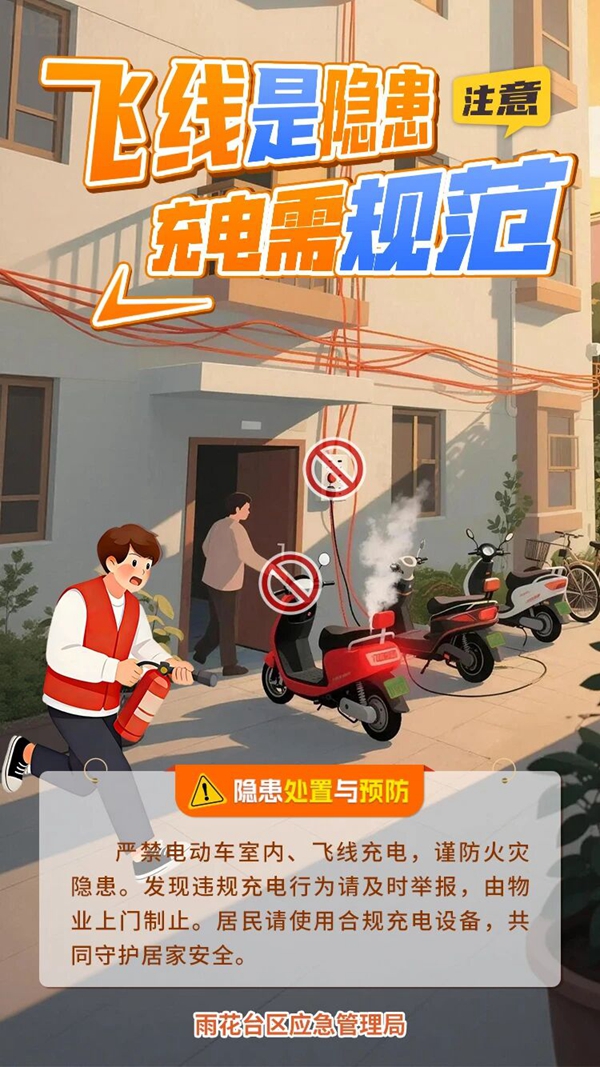 电动车给日常出行带来不少便利,但充电方式不对,就会变成 “移动炸弹”!把电动车推进室内充电、从高层窗户“飞线”下楼充电这些行为隐患极大,这类充电方式一旦引发火灾,火势蔓延速度极快,还会释放大量有毒气体,极易造成人员伤亡!