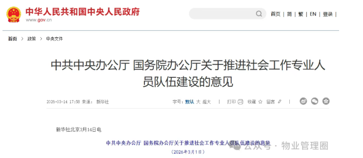 2026年3月14日,中共中央办公厅、国务院办公厅《关于推进社会工作专业人员队伍建设的意见》公开发布。