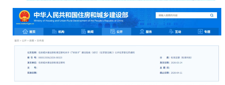 为全面落实党中央、国务院关于推动“好房子”建设的决策部署,住房城乡建设部组织起草了《“好房子”建设指南(试行)(征求意见稿)》(附件1),向社会公开征求意见。有关单位和个人可于2026年4月10日前将征求意见表(附件2)通过以下途径和方式反馈: