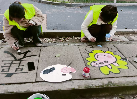 活动中,大家分工协作、默契配合,以井盖为独特画布,用画笔搭建起创意与美好连接的桥梁。有的志愿者专注勾勒可爱的卡通形象,粉嫩的小猪佩奇搭配明亮的黄色花瓣,童趣盎然、萌态可掬,瞬间拉近了与业主的距离;有的则深耕字体美化,以利落流畅的笔触勾勒出醒目的社区标识,既美观大方又传递着社区温情。从调色、上色到细节勾勒,每一个步骤都一丝不苟、精益求精,志愿者们用耐心与创意,将单调的灰色井盖赋予了鲜活生命力,一个个色彩斑斓、主题鲜明的彩绘井盖,摇身一变承担起美化园区环境的新使命,也渐渐成为小区里一道亮眼的风景线,吸引不少业主驻足观赏、拍照留念。